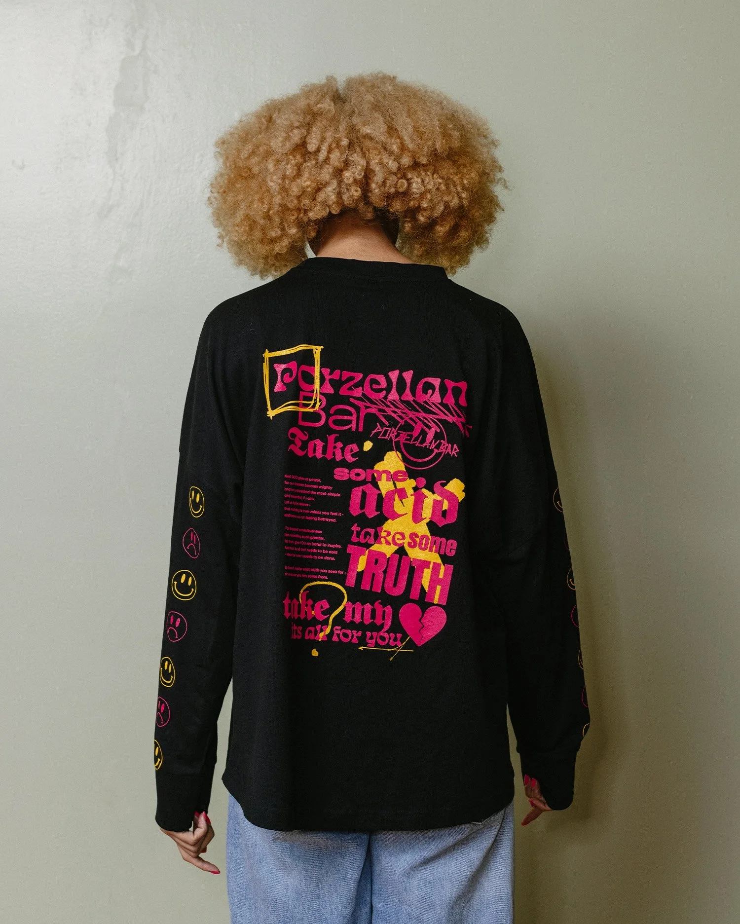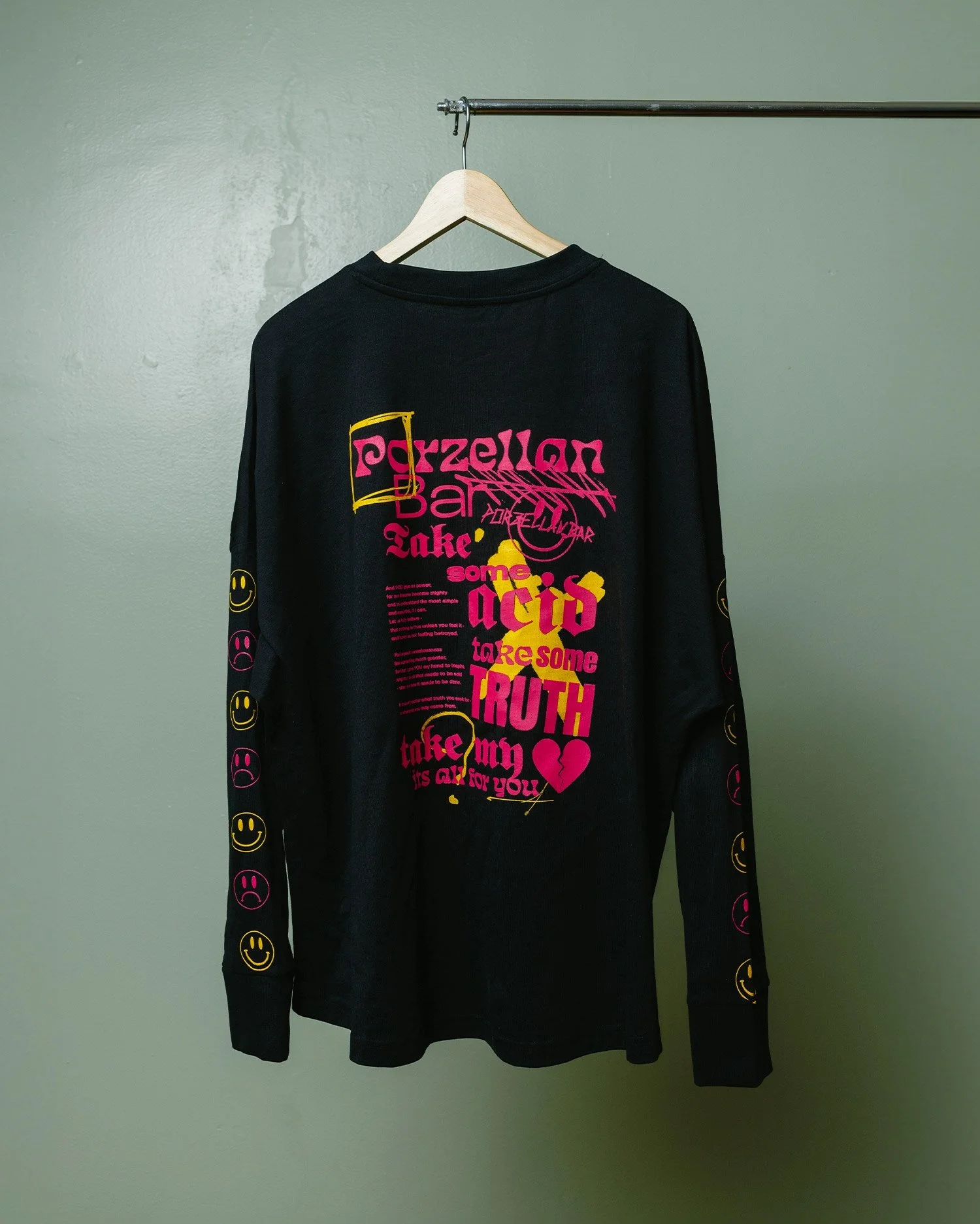 Discover the ultimate blend of style and comfort with our "Porzellan Bar - Punk" Long Sleeve. Made from 100% pure cotton, this long sleeve shirt is a staple for any season. The soft, natural fabric ensures durability and ease of care, making it a practical choice for everyday wear. Featuring a loose over shoulder cut with a contemporary edge, this long sleeve shirt showcases unique graphics that embody the spirit of Porzellan Bar. Whether you're heading to a casual outing or a late night party event, this versatile piece will elevate your wardrobe with its unmistakable punk flair and attention to detail.